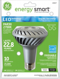 Compared to standard 45 watt Incandescent R30 reflectors, GE’s dimmable LED PAR30 uses only 10 watts, reducing energy consumption by